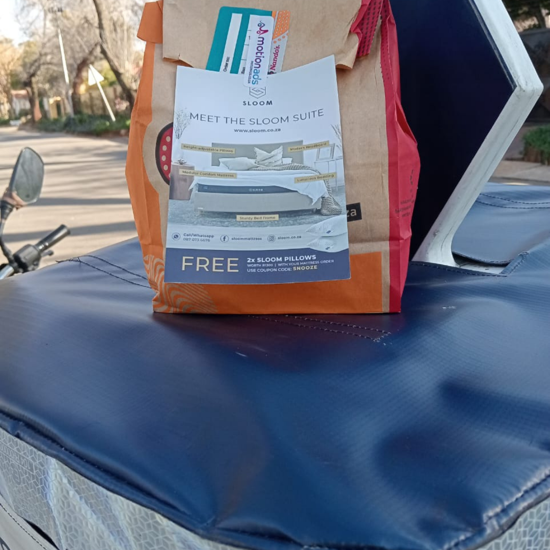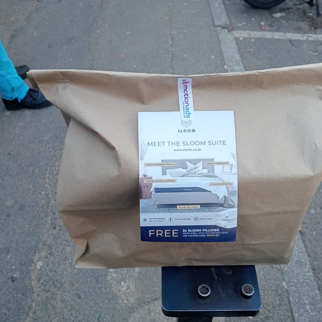 MotionAds deployed branded delivery bikes across Johannesburg and Cape Town, transforming our drivers into moving Sloom billboards while navigating their daily delivery routes. In addition to the branded top-boxes and booster-fins, our drivers distributed another advertising touch point directly into the hands of customers by attaching our in-home flyers to every order. Each one featuring a clear call-to-action, discount codes, and simple sign-up instructions driving traffic to Sloom’s online store.