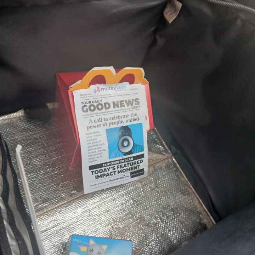 MotionAds provided a solution rooted in real-world human interaction. By having our Uber Eats delivery drivers physically handing flyers to consumers, the campaign created a moment of pause - allowing people to engage with the message in a way that felt considered rather than intrusive. “This just gave us a bit of an opportunity to reach a few thousand people and put good news in their hands," says Garreth, "not with the intention to sell, but rather to just highlight good news stories and campaigns."