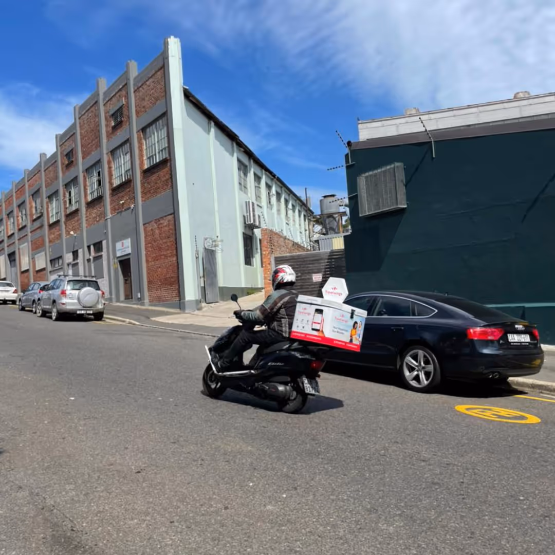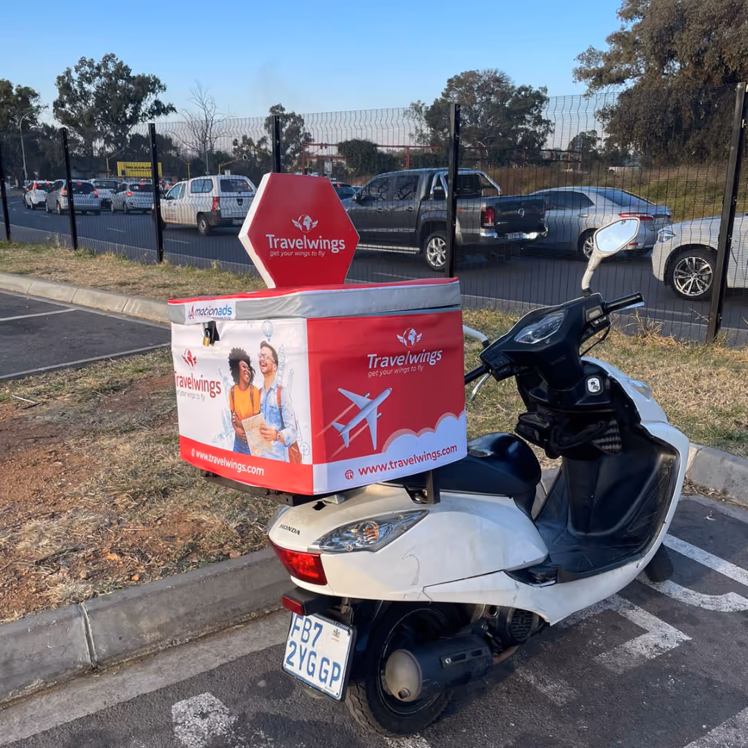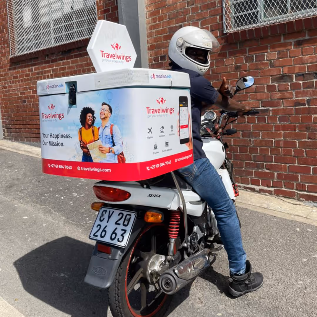 MotionAds provided a three-pronged marketing engine that combined street-level exposure, home-delivered touchpoints and dynamic digital storytelling - all built around a network of our branded delivery bikes. These bikes acted as moving billboards, placed strategically in high-LSM neighbourhoods across Johannesburg, Centurion and Cape Town. Crucially, the messaging on each top-box and booster fin was tailored to each city: for example, bikes in Johannesburg promoted flights and packages to Cape Town, while bikes in Cape Town highlighted deals to safari and bush destinations. This localisation created relevance and appeal no matter the audience.