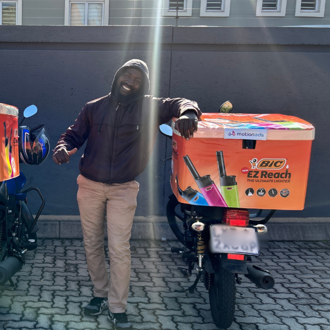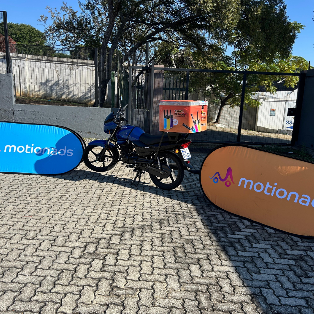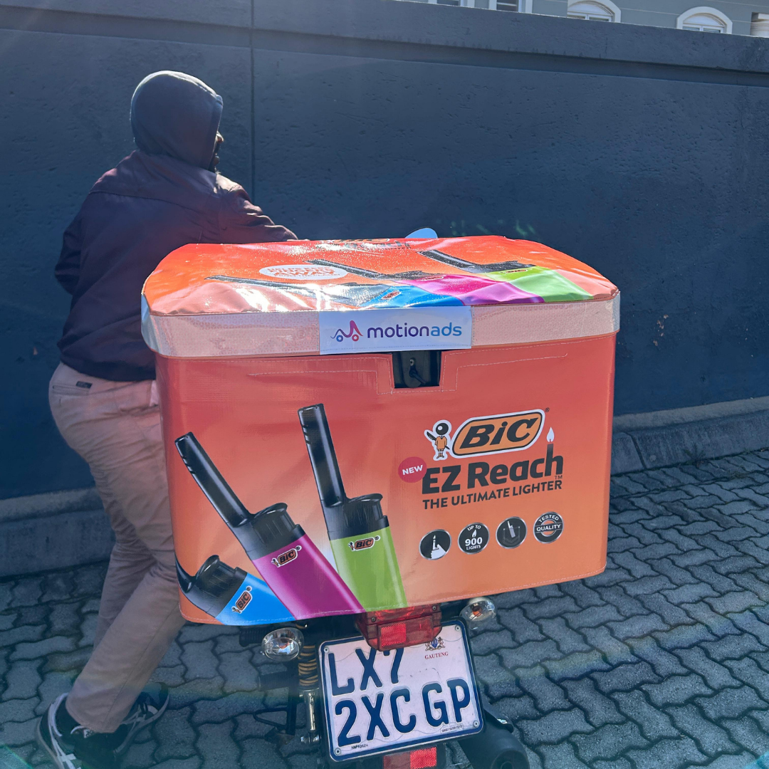 BIC partnered with MotionAds to execute a multi-layered awareness and engagement campaign across Johannesburg and Cape Town. Branded delivery bikes were deployed as moving billboards, using eye-catching branded top-boxes to create strong visual impact across high-traffic urban environments.