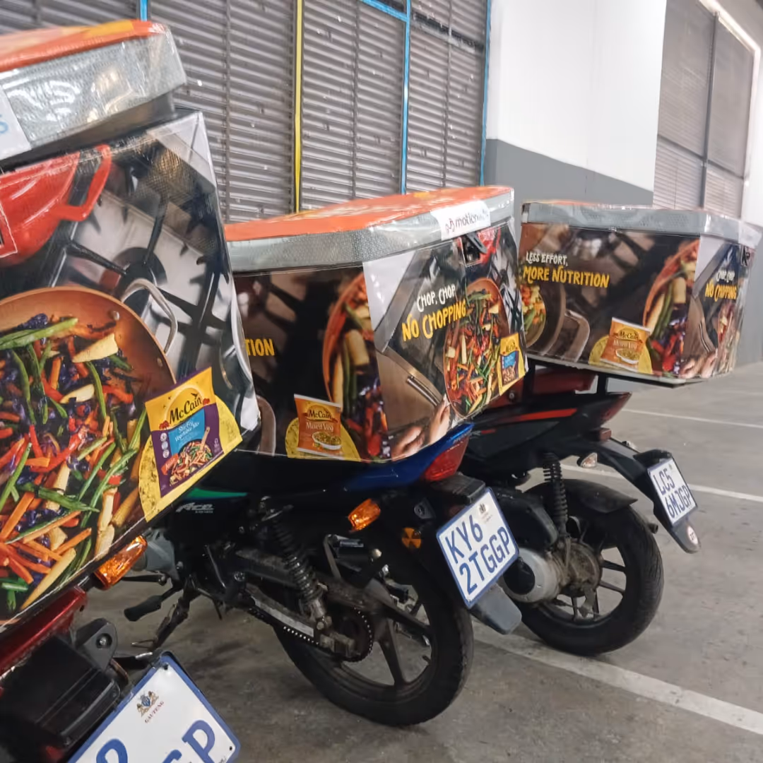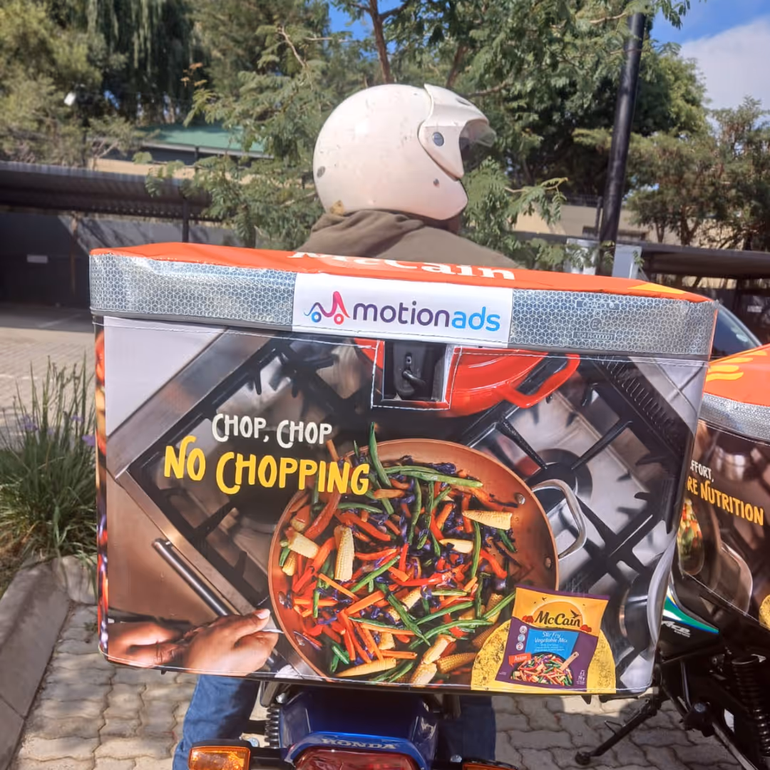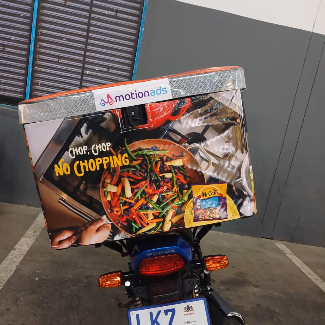 MotionAds brought “Share the Joy with McCain” to life through a high-impact top-box and in-home flyer campaign on branded Uber Eats bikes across Johannesburg’s northern suburbs. Each delivery featured a recipe card, taking their message into the homes of their audience, inspiring easy, delicious meals made with McCain products.